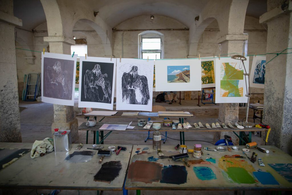 Im Kurs Farbholzschnitt von mehreren Platten beschäftigen wir uns mit der spannenden Überlagerung farbtransparenter Flächen, Linien und Strukturen. Im leicht zu schneidendem japanischem Sperrholz entwickeln sich unsere Formen und Motive und wir lassen uns völlig von der Inspiration und dem Prozeß leiten.