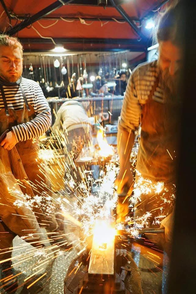 Ich möchte euch in dieser Woche beibringen dass am Ende dieses Workshops Eure Idee mit euren eigenen Händen entsteht. Ihr bekommt ein bisschen Geschichte und einen Exkurs zur Materialtheorie. Ich erkläre und zeige euch die Schmiedengrundtechniken. Ich werde euch individuell unterstützen mit Beratung oder mit Zuschlagen.